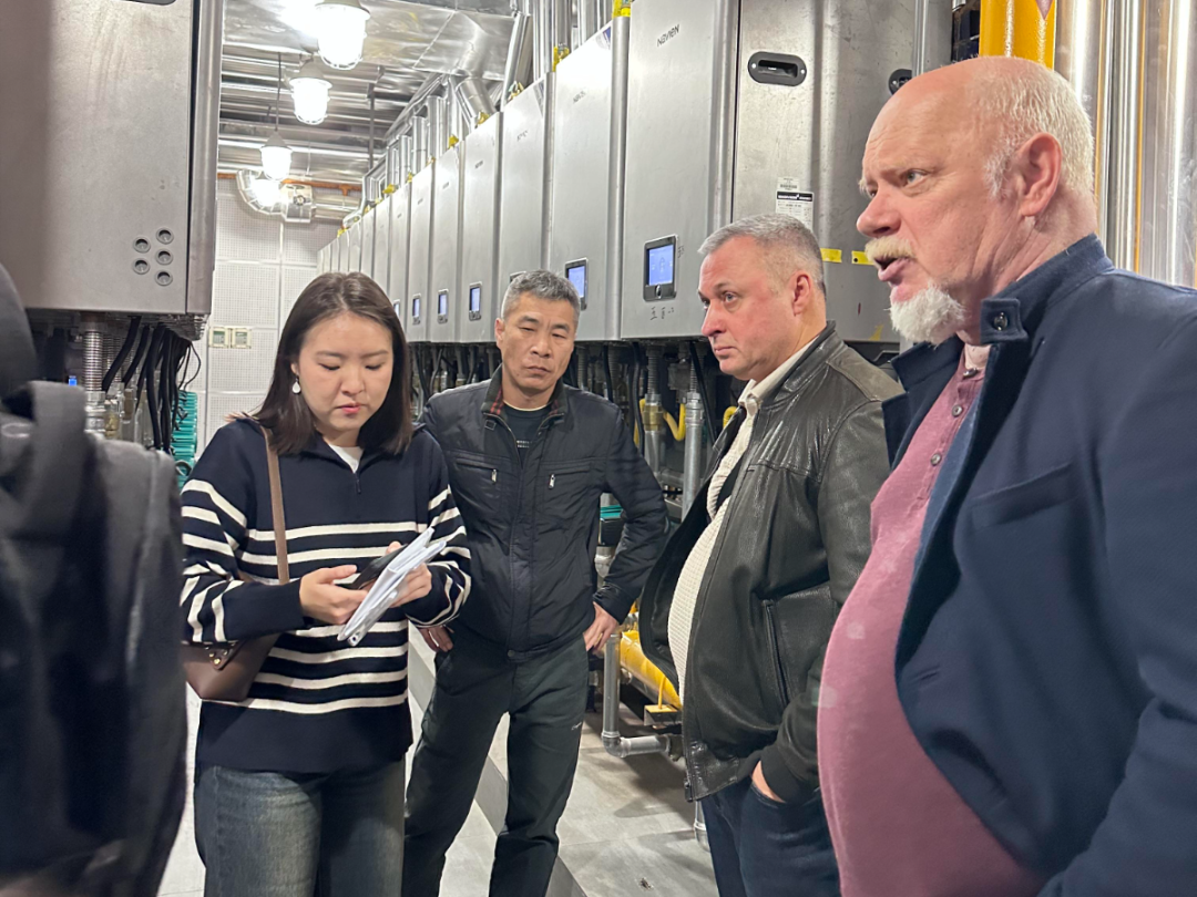 第二站,參觀團(tuán)隊(duì)前往北京興濤社區(qū),這里100臺(tái)NFB-98HC并聯(lián)系統(tǒng)的高效運(yùn)轉(zhuǎn)讓俄羅斯伙伴嘖嘖稱奇。這套系統(tǒng)以其智能調(diào)節(jié)和節(jié)能環(huán)保性能成為城市供暖的“隱形英雄”。尤其是煙氣余熱回收技術(shù),將排煙溫度降至20℃以下,不僅顯著減少了能源浪費(fèi),還有效解決了冬季“白煙滾滾”的困擾。這一技術(shù)憑借其高效節(jié)能和環(huán)境友好的特點(diǎn),展現(xiàn)了廣泛的應(yīng)用潛力,贏得了國際合作伙伴的高度評(píng)價(jià),被認(rèn)為在寒冷地區(qū)具有重要的推廣價(jià)值。更值得一提的是,通過遠(yuǎn)程智能APP控制,社區(qū)供暖實(shí)現(xiàn)了無人化管理,大大降低了運(yùn)營(yíng)成本,也為未來城市供暖方案提供了新方向。